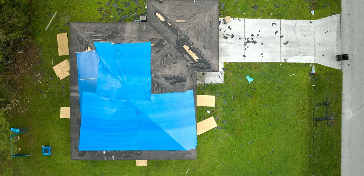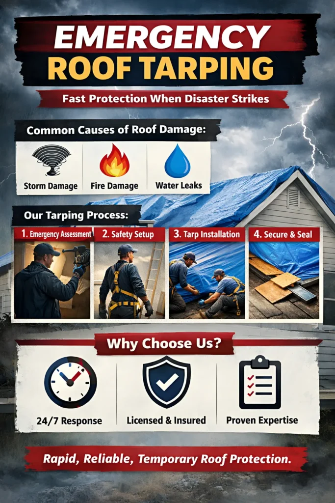 Emergency tarping is a temporary roofing solution that provides an immediate seal to prevent further interior water damage, mold growth, or structural issues. It’s typically used after severe weather events, fires, or accidents that compromise your roof’s integrity.